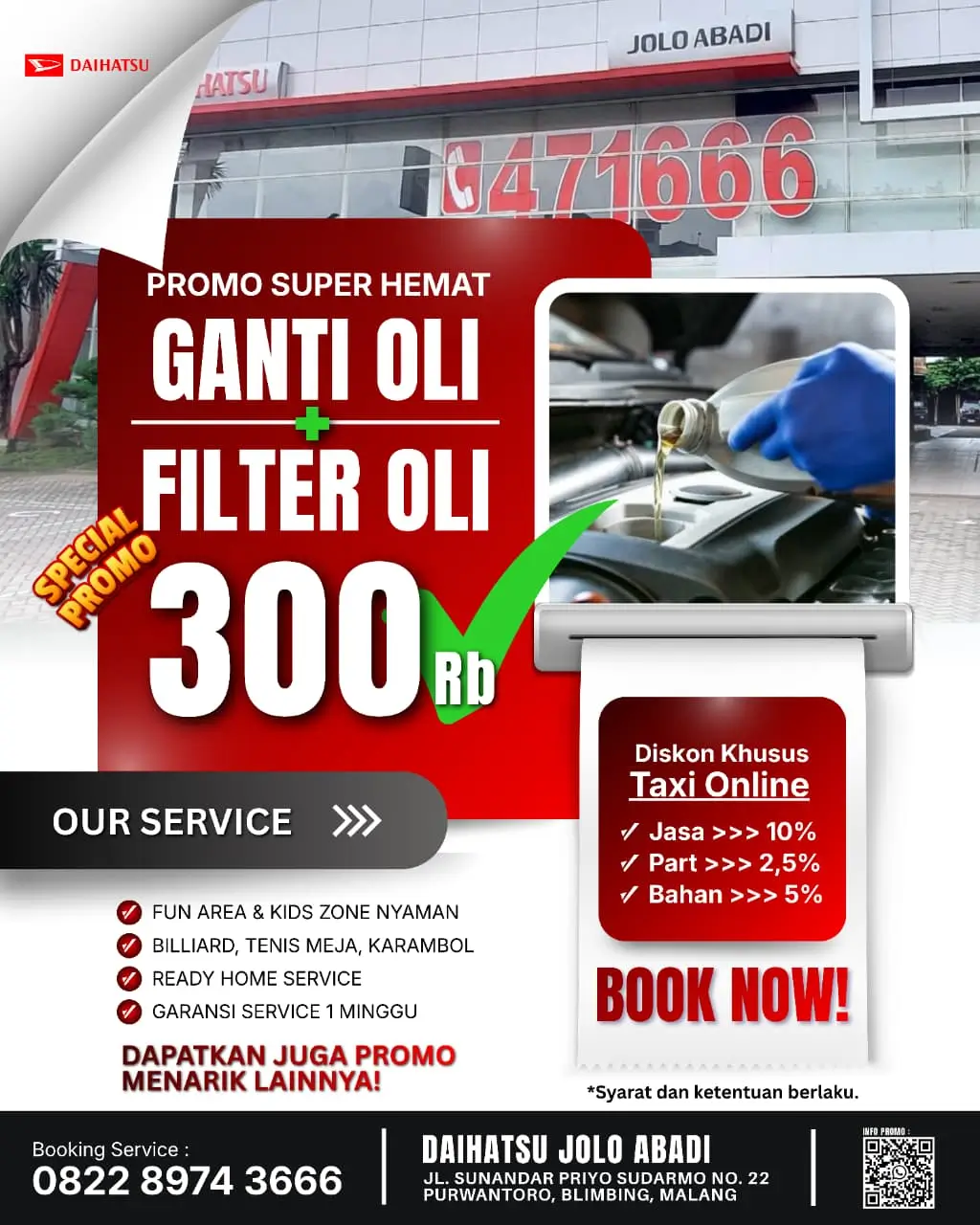Nikmati promo service hemat untuk mobil Daihatsu Anda! Dapatkan paket ganti oli dan filter oli dengan harga terjangkau serta berbagai fasilitas dan keuntungan tambahan untuk kenyamanan service Anda.